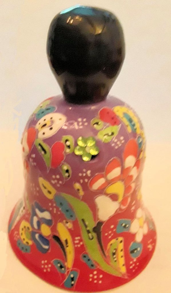 Mary Lou sent us this colorful bell. It is a traditional handmade Turkish pottery bell with a bead clapper. This bell was made using patterns and methods dating from the 16th Century. Each bell is handmade so no two are exactly alike. Size is 5″ tall and 3″ wide at the bottom. She said it was about $40 so affordable.